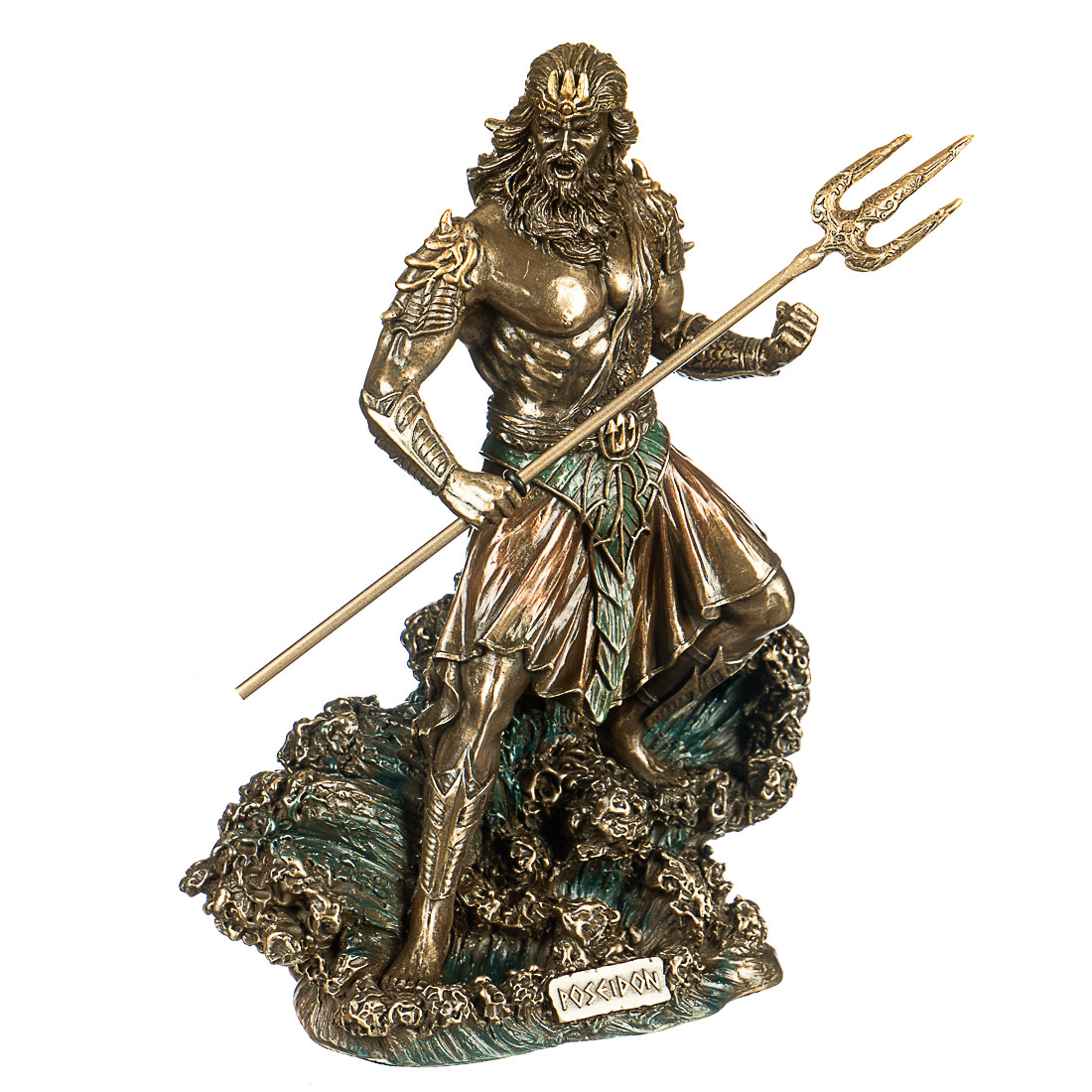 Бог морей – Посейдон. Он один из трех главный Олимпийский богов вместе с Зевсом и Аидом. Посейдон со своей женой Амфитритой обитали на морском дне в роскошном замке. В его руке всегда находиться трезубец, которым он вызывал бури и штормы, разбивал скалы и ударял по земле, что приводило к образованию родников пресной воды.Такой подарок прекрасно подойдет для босса, руководителя, коллеги, друга, учителя истории.Статуэтка изготовлена из полистоуна (искусственного камня) и покрыта бронзовым напылением. Упакована в красивую подарочную упаковку. Так что, покупая эту статуэтку вы покупаете ценный и красивый подарок, не требующий дополнения.